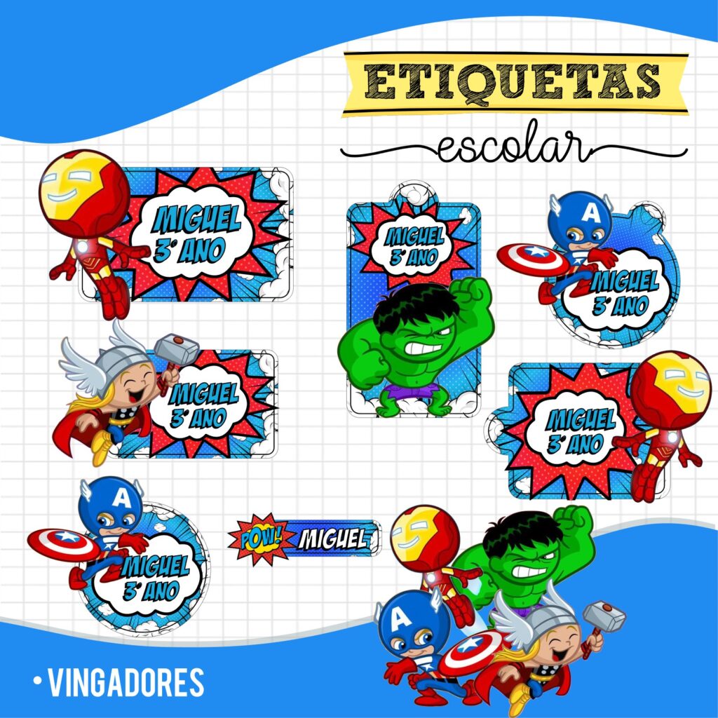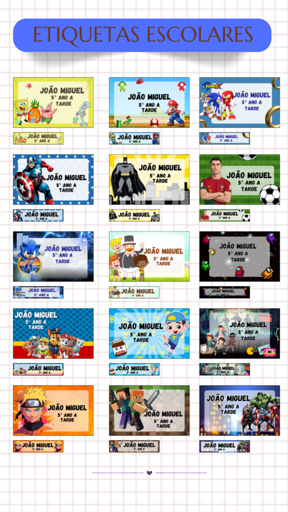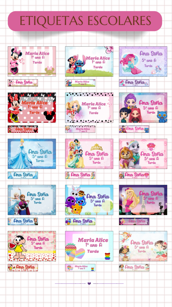 É um pacote digital com mais de 300 modelos de etiquetas escolares prontas, totalmente editáveis no Canva, ideais para mochilas, cadernos, estojos, squeezes, uniformes e muito mais.