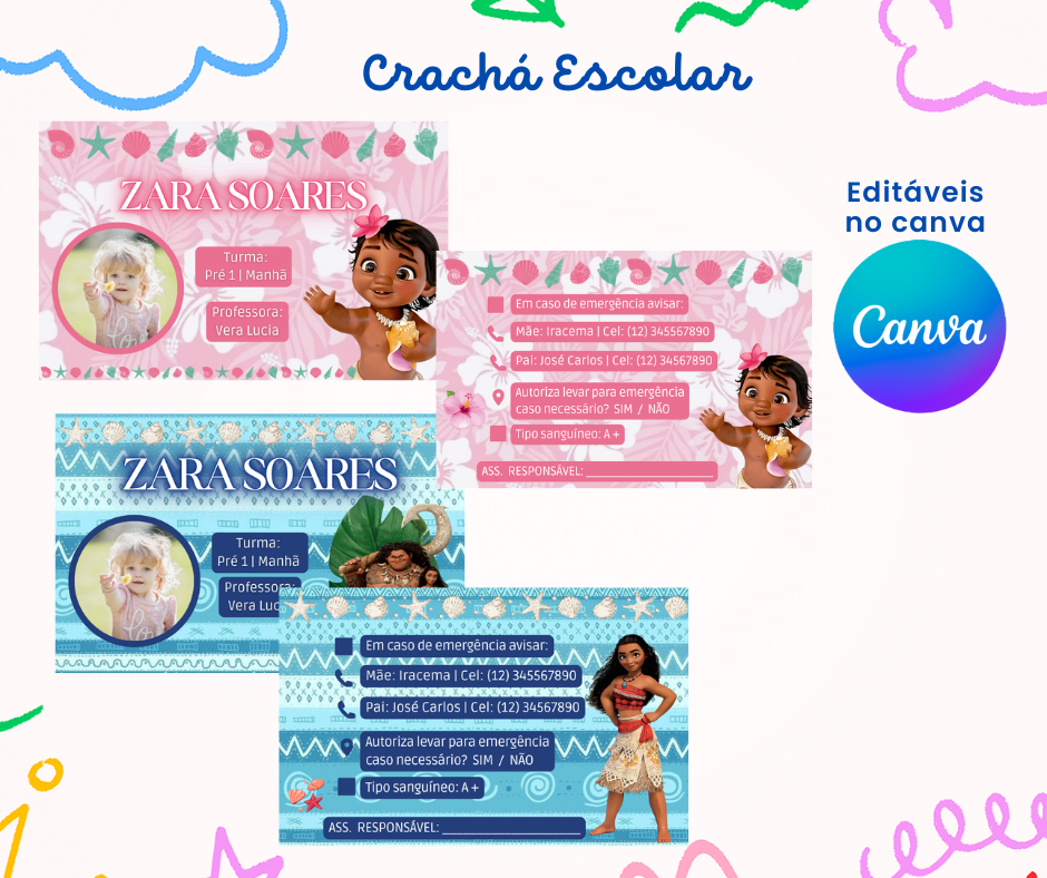 Você também recebe um pack de Crachá Escolar Editável no Canva, pensado para facilitar a identificação das crianças e trazer ainda mais organização e segurança no dia a dia escolar.
